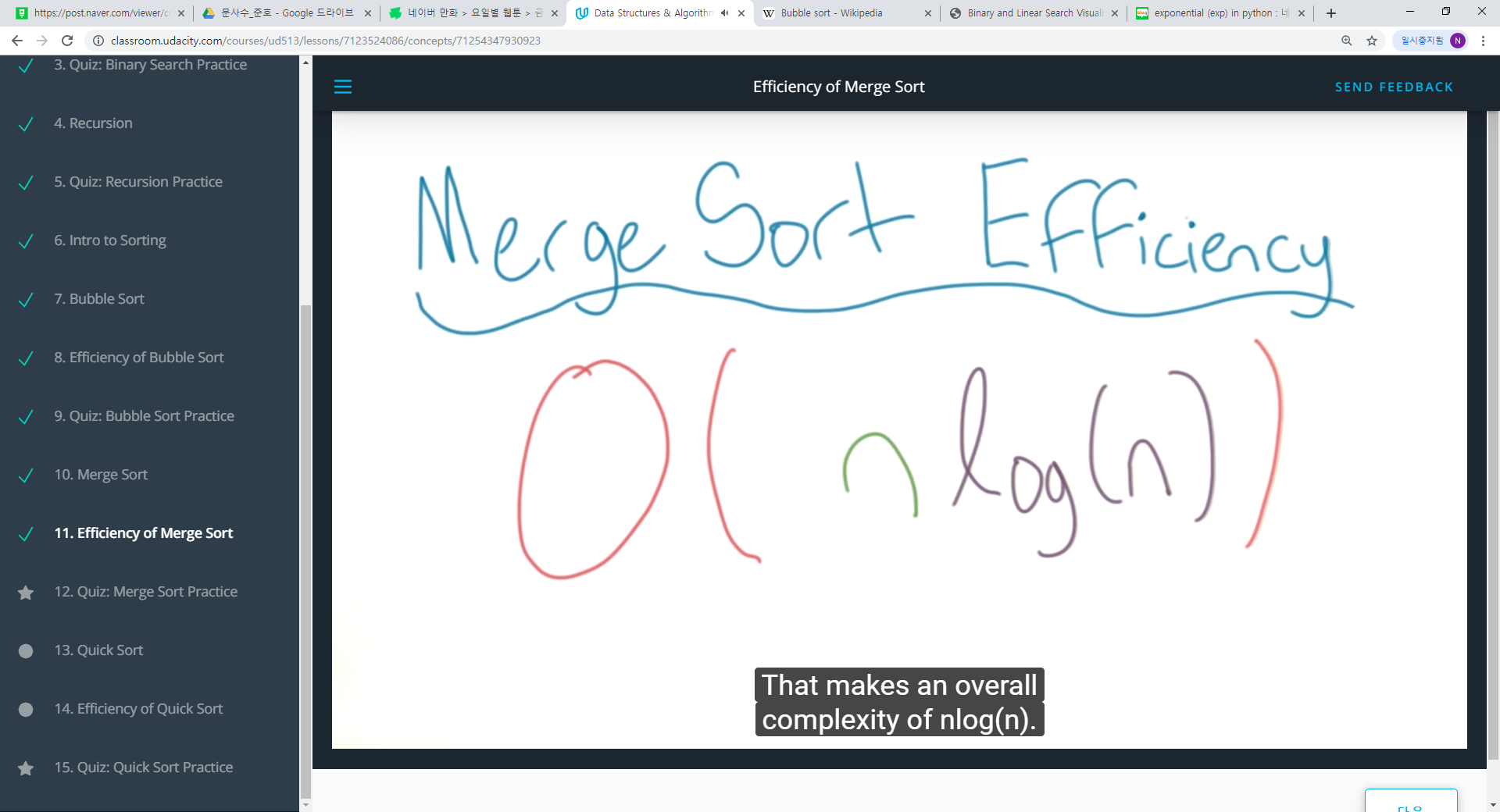 8-3. 바이너리 서치를 했던 때와 같이 log(n)의 속도로 증가한다. 매 단계에서 비교가 반복되는 횟수도 대략 "n"이기 떄문에 log(n)에 n을 곱한다.