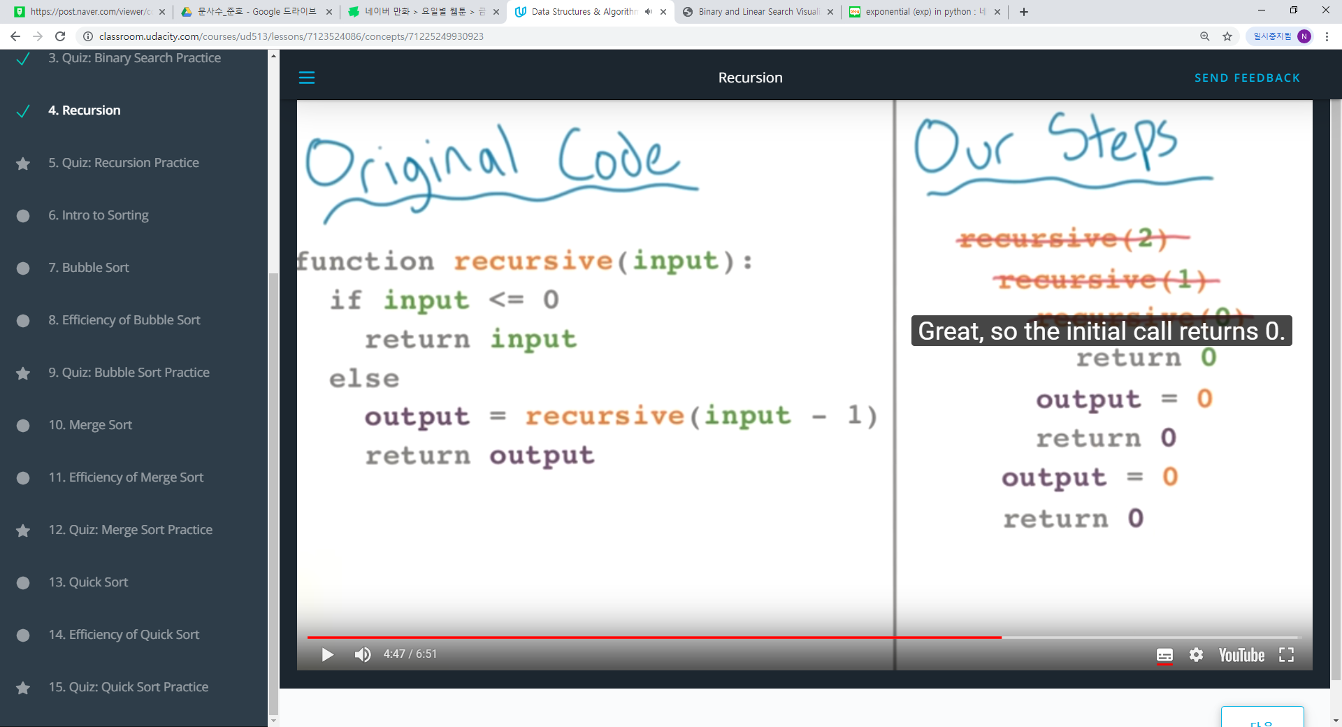 10. 답안지를 보고 풀면서도, 감탄스럽다. 리커선을 이용하여, 더 이상 반복되지 않는 곳을 답으로 만들게 하는 것이 정말 신기하다.