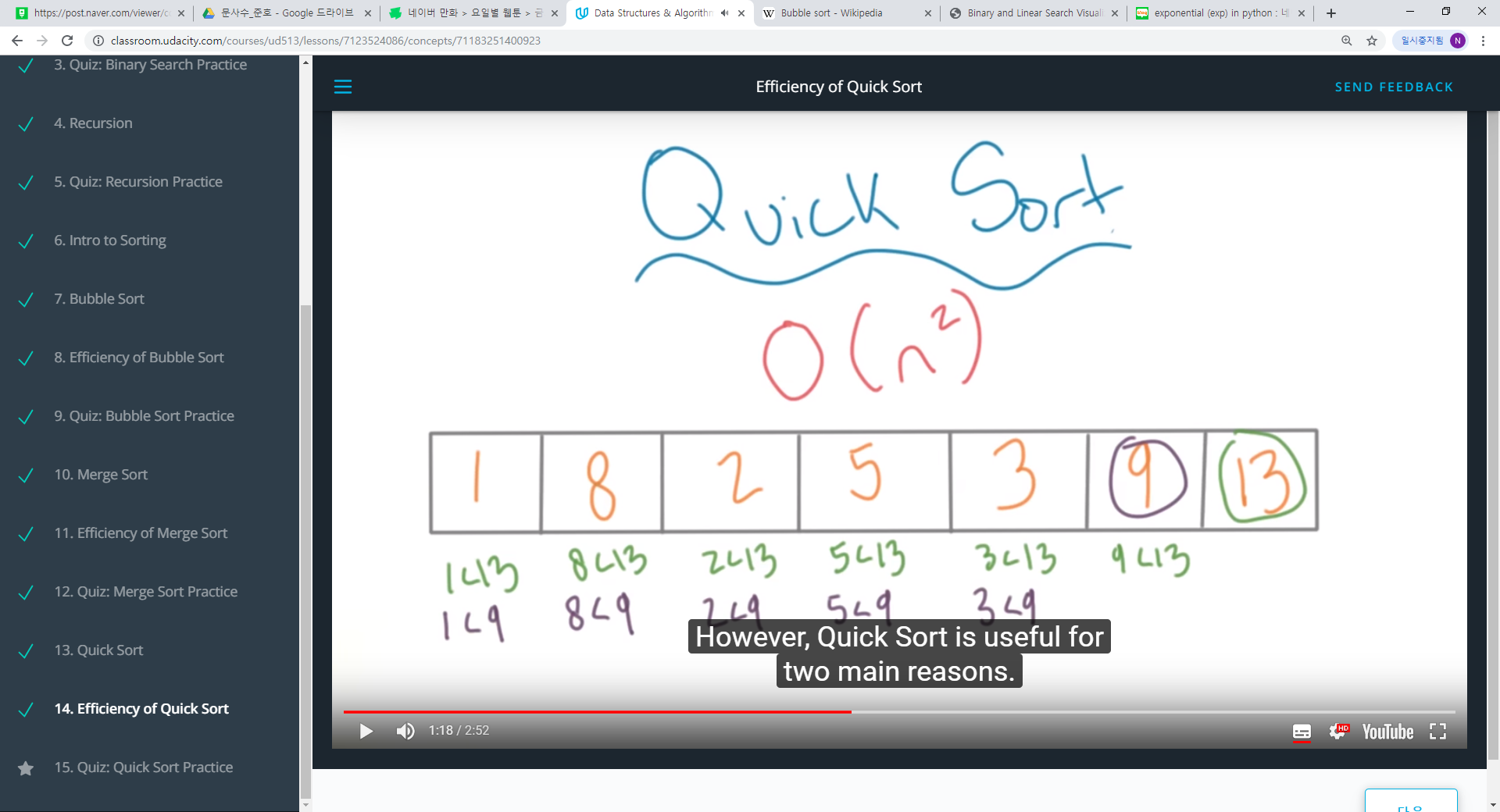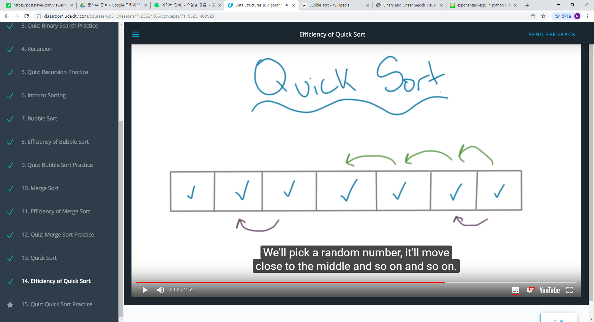 9-4. 하지만 평균과 최적의 경우는 O(nlog(n))이다. 중간 중간 딱 맞아 떨어진다면 머지 소트와 비슷해진다. 위에서 봤던 것처럼, 이미조금 솔팅이 되어있다면 퀵솔트를 쓰면 효율이 좋지 않아진다.