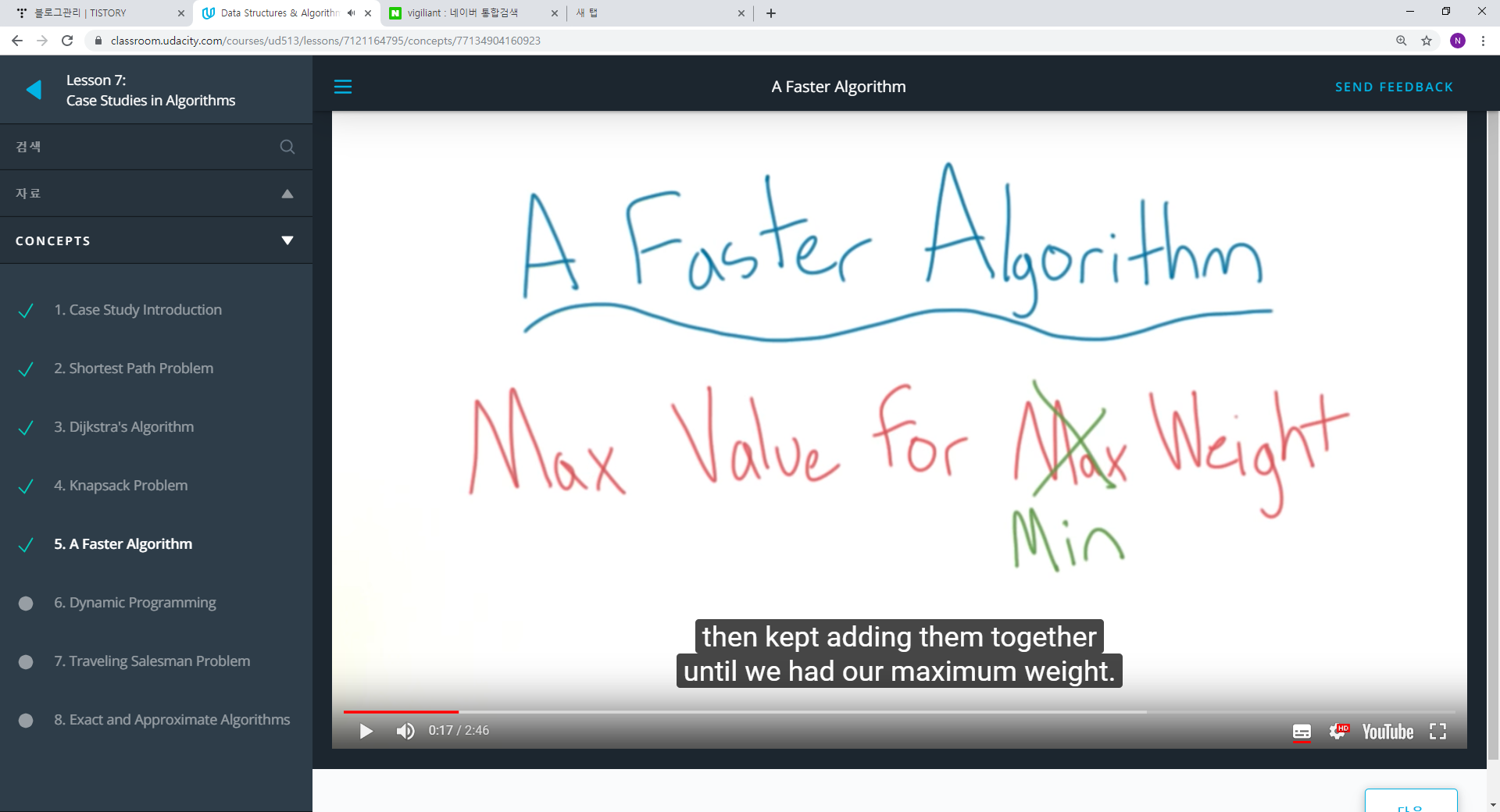 1. 좀 더 빠른 방법, 똑똑하게 생각해보자. 만약 우리가 가능한한 적은 무게에 대해 값을 최적화 한다면 어떻게 될까? 그리고 우리가 가지고 있는 무게 제한이 될 떄까지 아이템을 추가한다면 어떻까?