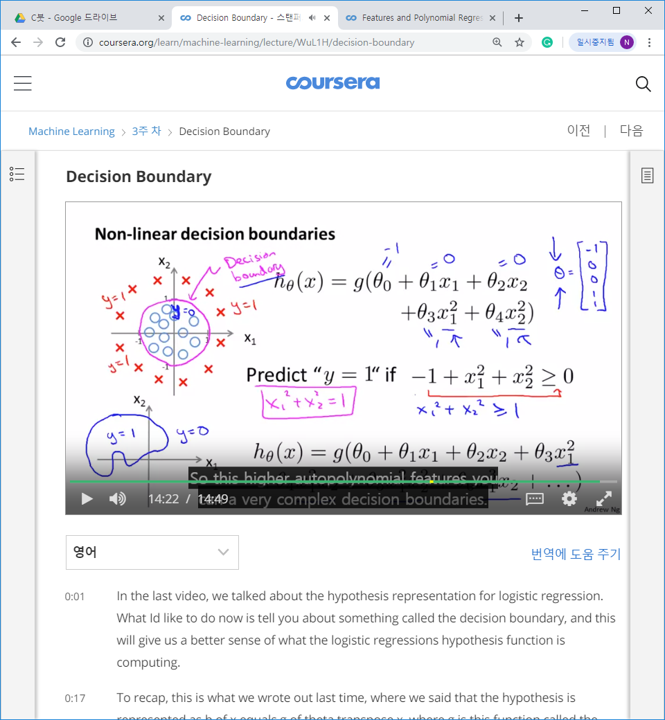 1. 조금 더 복잡한 형태에서의 분류를 보면, 원 형태의 결정 경계를 볼 수도 있다. 중요한 것은 데이터 셋으로 부터 이 경계가 결정 되는 것이 아니라, 가설 세타에 의해서 결정 경계가 결정된다는 것이다.