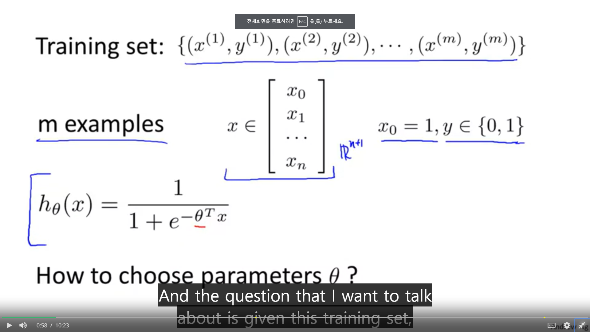 1. 그렇다면 로지스틱 회귀의 비용함수는 무엇일까? 어떻게 파라미터 세타를 선택해야 할까?