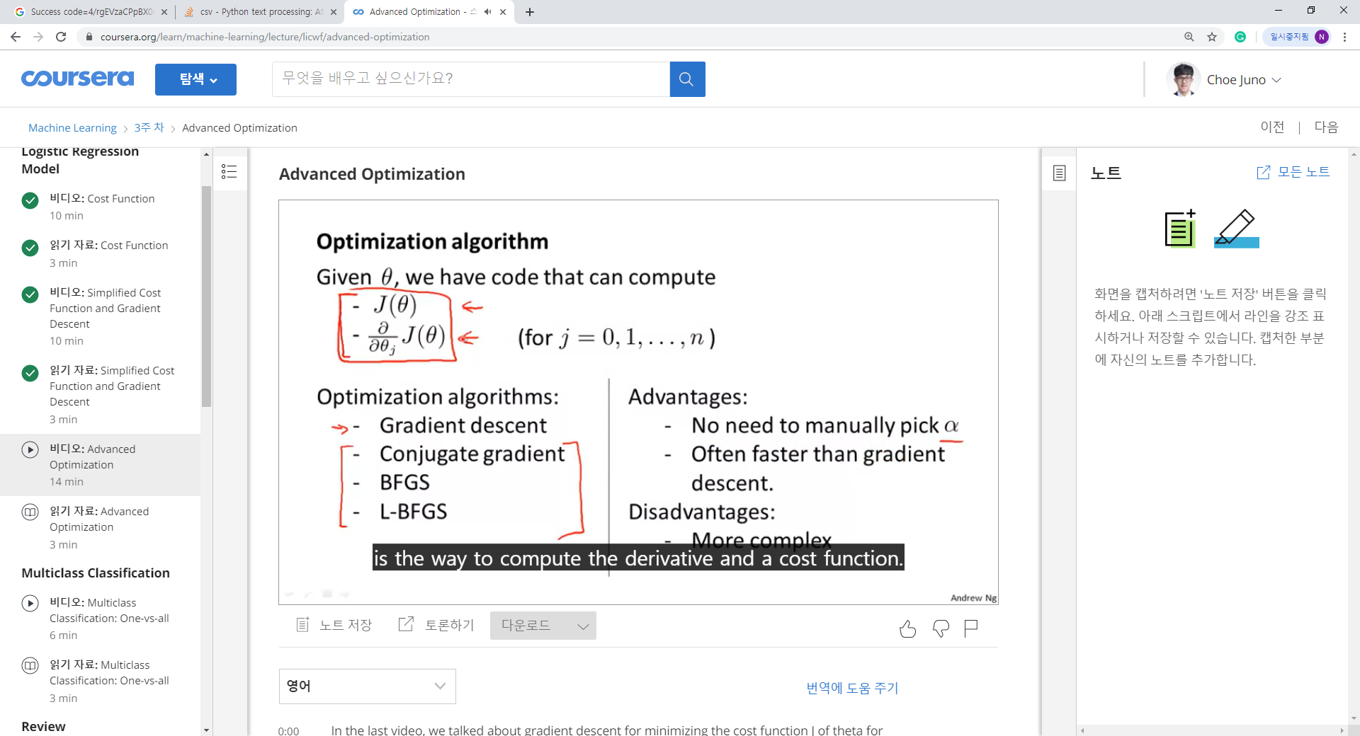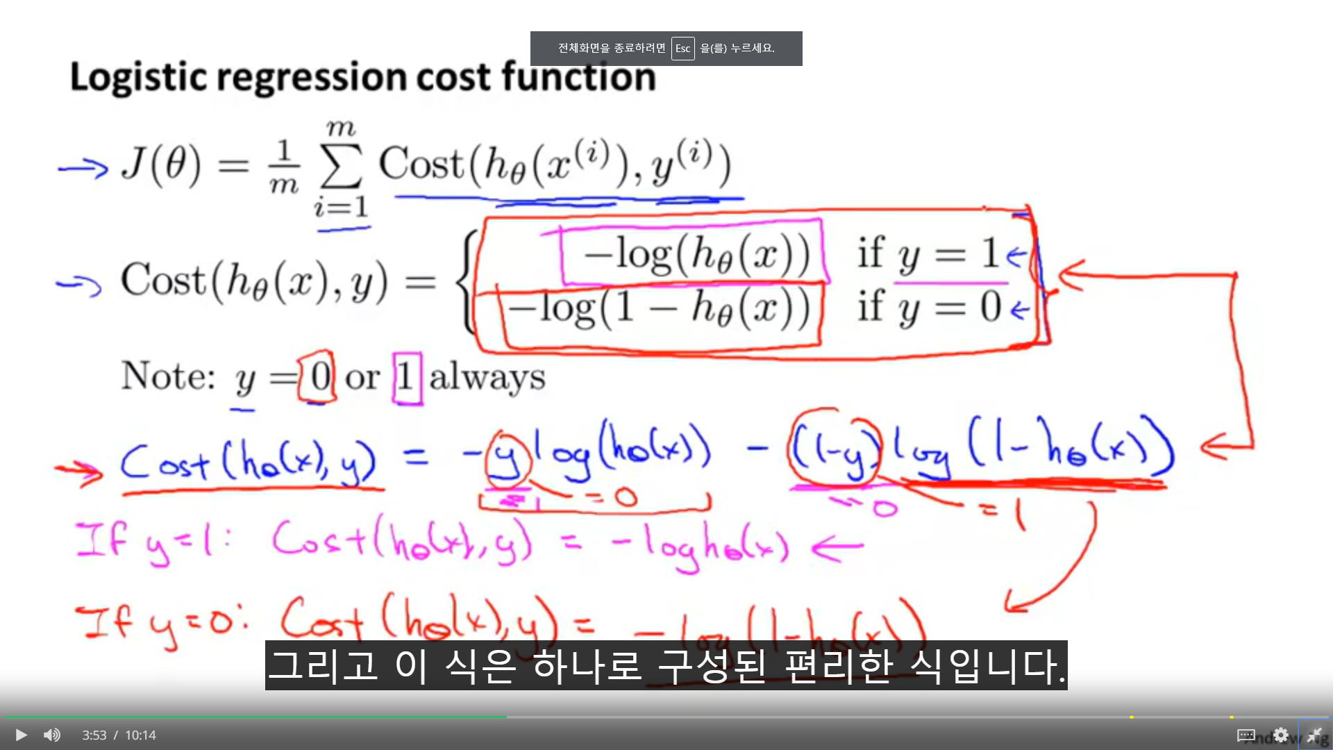 1. 비용함수를 축약한 형태가 중간의 파랑색 글씨와 같은 식이 된다. 어떻게 둘이 같을까 생각한다면 한번 y=1일 때와 y=0일 넣어보라. 그러면 결국에 위와 같은 식이 나오게 된다.