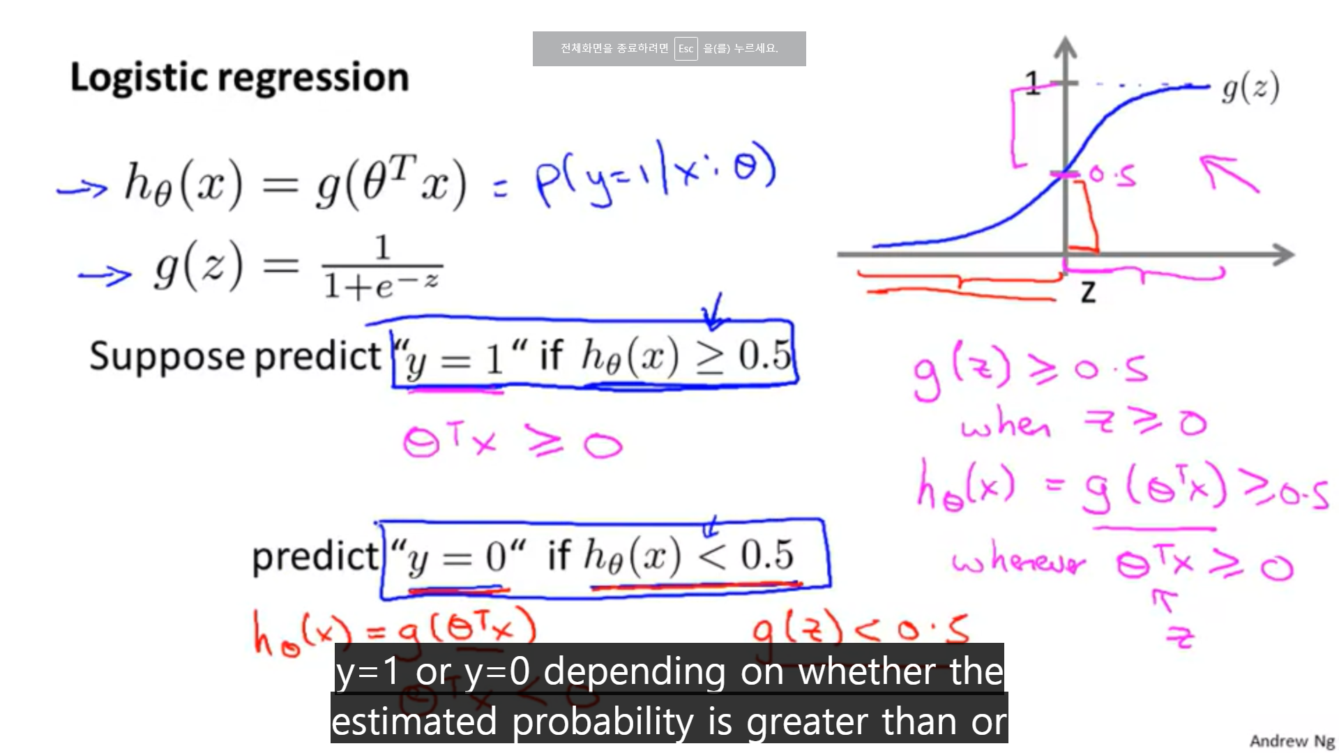 2. 이 말이 의미하는 것은 세타에 의해 파라미터화된 주어진 X가 1의 값을 가질 확률이라는 의미가 된다.