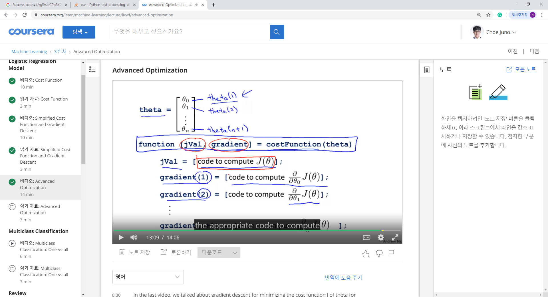1. Octave의 라이브러리를 이용하여 최적값을 찾는 것을 보여주셨다. option을 먼저 정의하고 초기 세타값을 설정하여 준뒤, 비용항수를 넣어주면, 값을 계산할 수 있게된다.