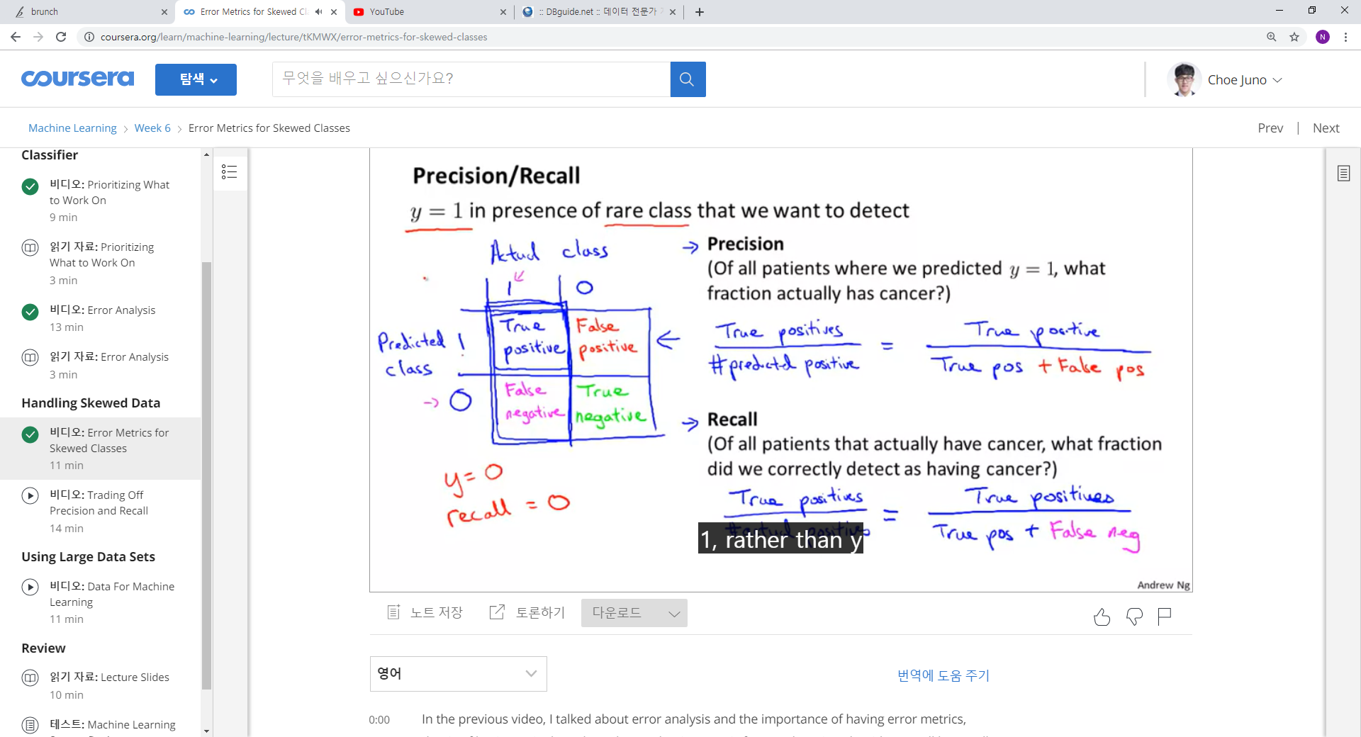 1. 알고리즘을 조정함으로써, 판단을 내리는 임계점을 수정할 수가 있으며, 임계점이 이동함에따라, Precision과 Recall은 변화한다. Precision이 높다는 것은 전체 예측에서 정답의 비율을 보는 것이기 때문에, 높은 정확도를 가짐을 의미한다. Recall이 높다는 것은 전체 클래스 1에서 1로 예측된 비율이므로, 예측이 정확할수록 높은 정확도를 가진다.