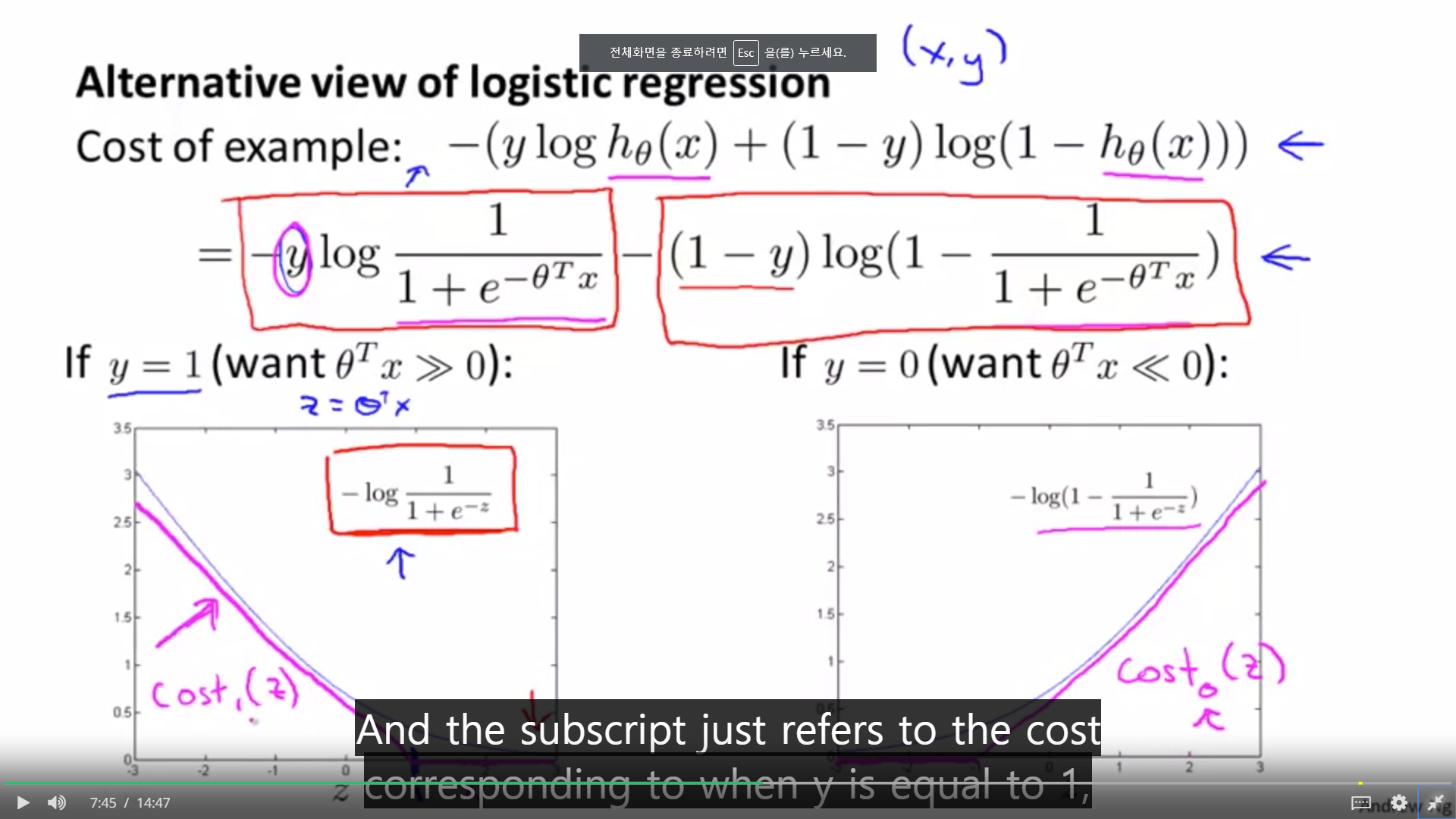 1. SVM의 비용함수는 위에서 보는 것처럼, y값이 1일 때는 z가 1보다 커야 0이며, y값이 0일 때는 z가 -1보다 작아야 비용이 0이된다.