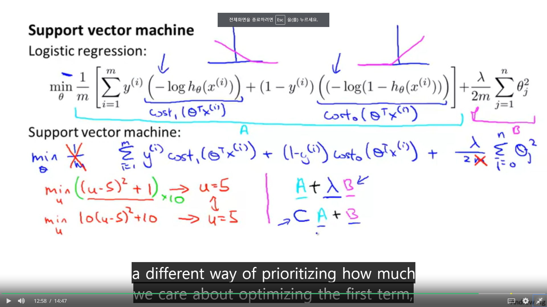 1. Logistic Regression의 공식은 위와 같다. SVM은 약간 변형된다. 이전 슬라이드의 직선 그래프를 SVM의 비용함수1, 비용함수 0이라고 할 때, log부분을 치환할 수 있다.