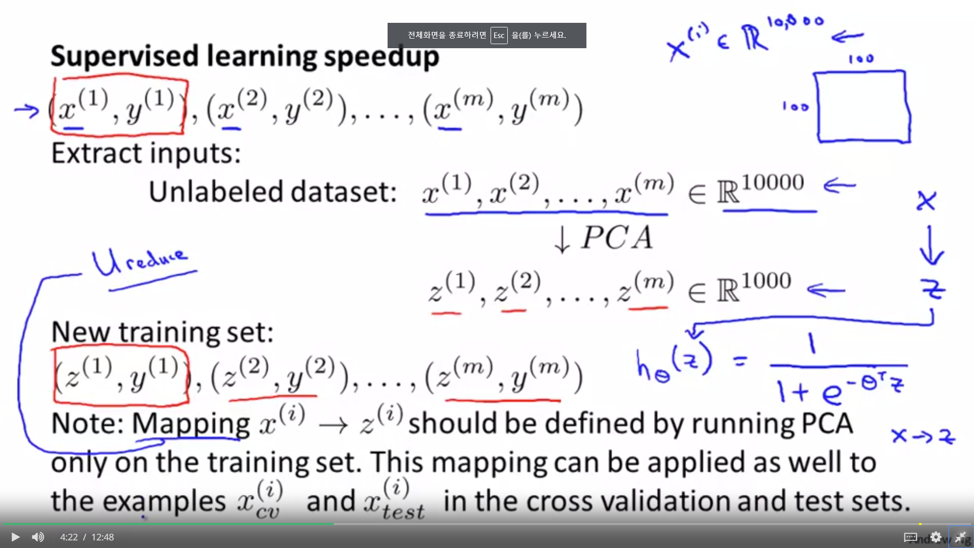 1. PCA 자체가 속도를 높이기 위해 사용되기도 하는데, 주의할 점은 차원축소에서 사용되는 축소방법이 똑같이 테스트 셋에도 적용이 되야 한다는 것이다. 그렇기 떄문에 Mapping(U_reduce)는 트레인 셋에 의해서만 정의되어야 한다.
