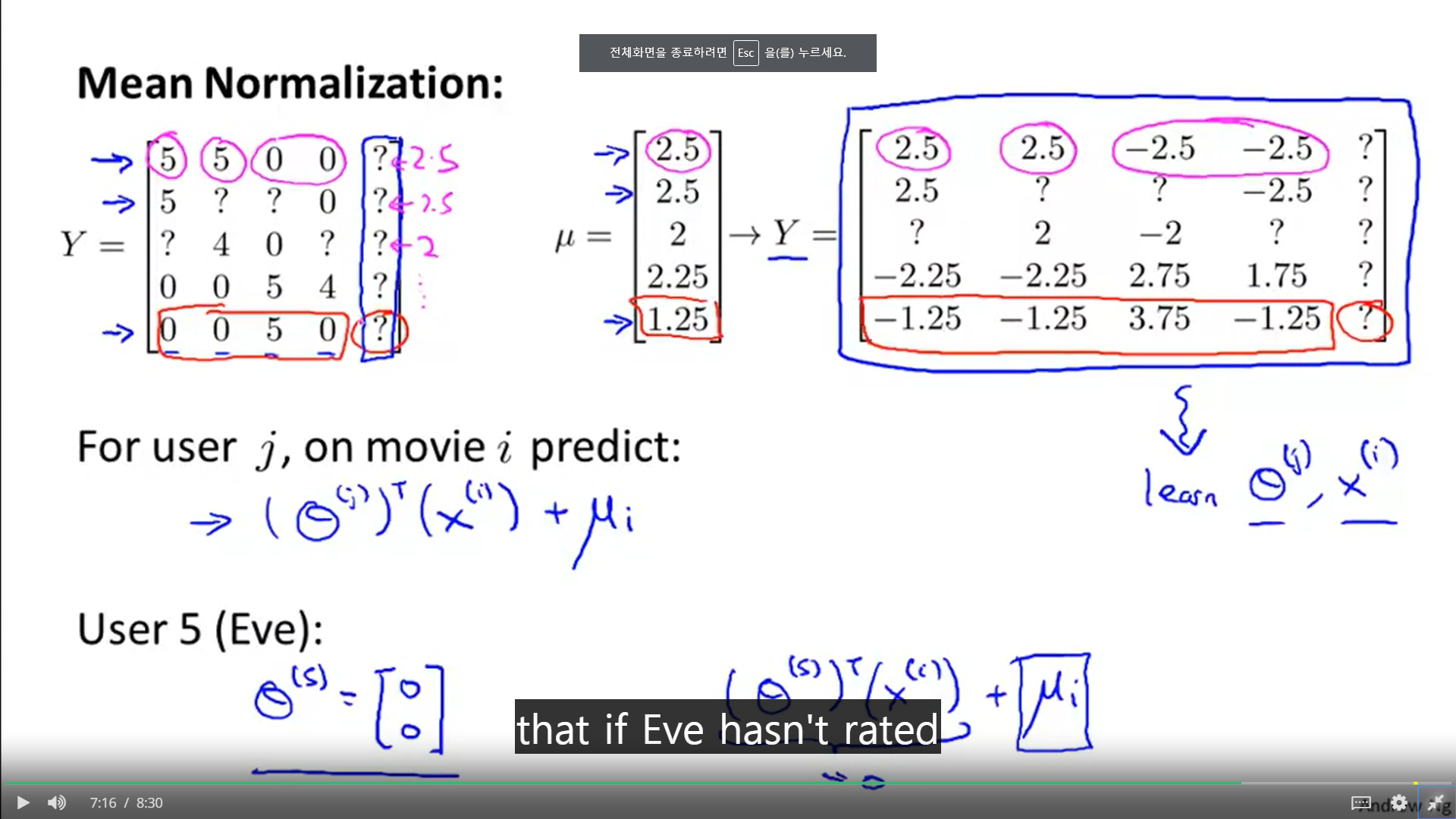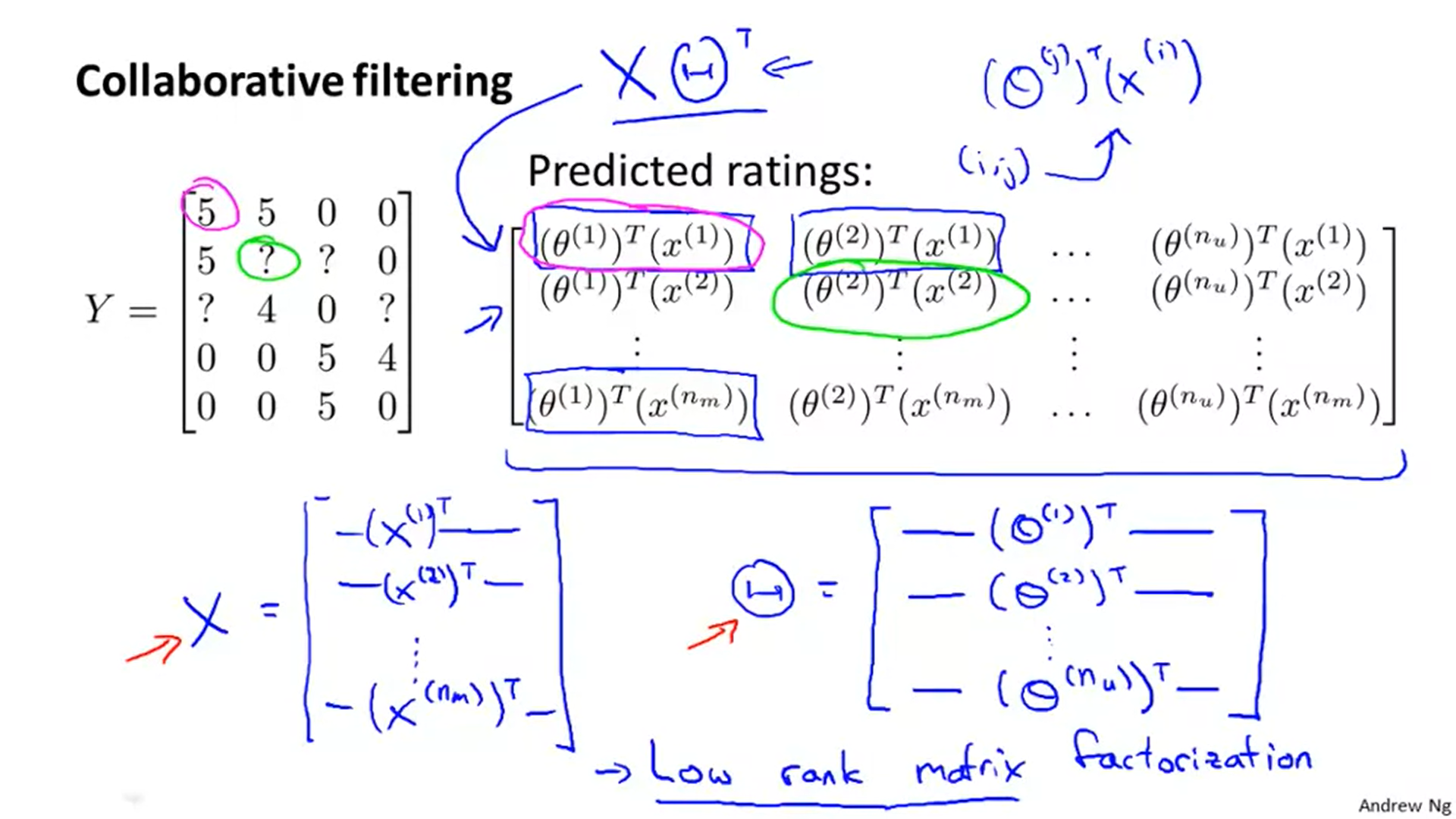 1. 우리가 위에서 공부했던 것은 간단하게 행렬로 표시될 수 있다. 컨텐츠의 피쳐를 담은 X행렬과 사용자의 성향을 담은 세타 행렬의 곱을 통해서 말이다.