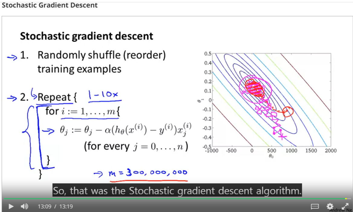 1. 이 방법은 정말, 데이터 셋이 많을 때 사용해야된다. 어중간 하면 그냥 배치 경사하강을 쓰면된다. 배치 경사 항강과 스톸케스틱의 최종 세타는 다를 수는 있지만 근사는 한다고 한다.