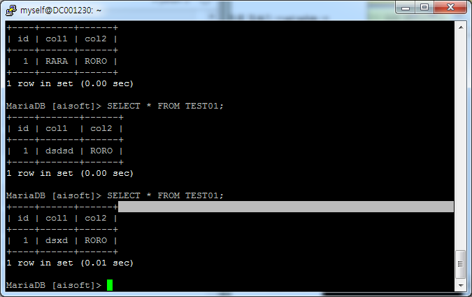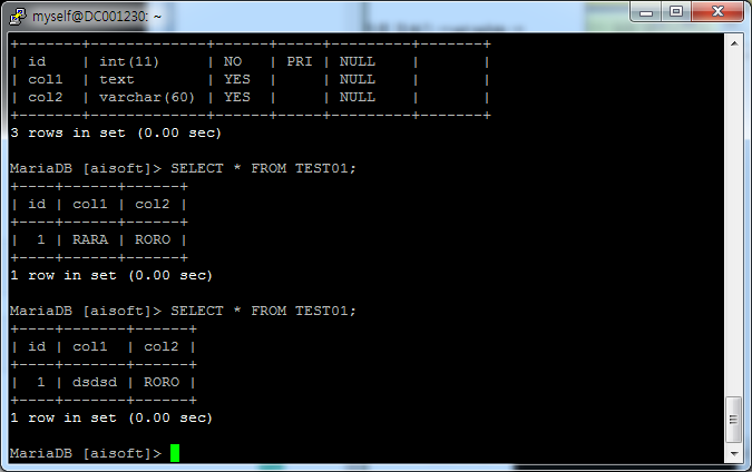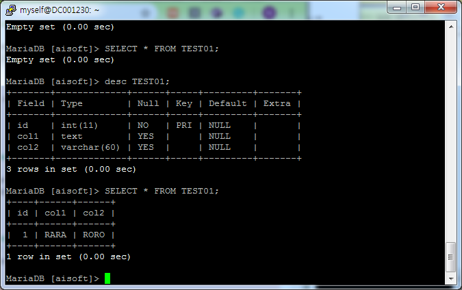 sqlINSERT ="INSERT INTO TEST01 (id, col1, col2) VALUES(1, 'RARA', 'RORO'); "