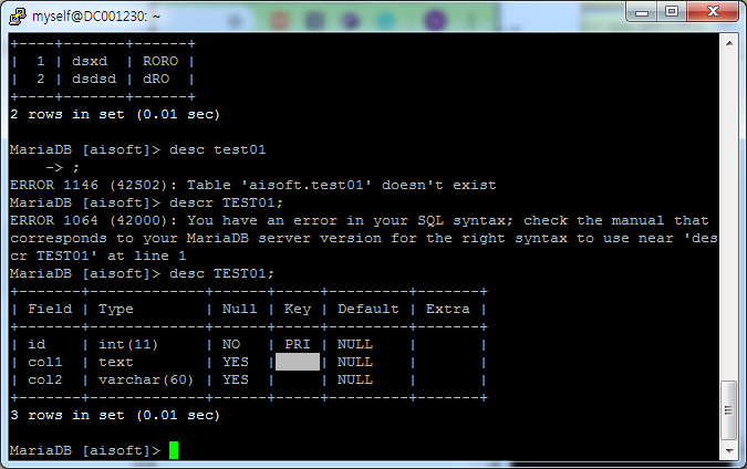 sqlCREATE = "CREATE TABLE TEST01 (id int NOT NULL, col1 TEXT, col2 VARCHAR(60), PRIMARY KEY(id));"
